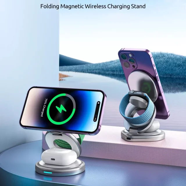 What sets this charging station apart is its convenience and versatility. The 3-in-1 design allows you to charge all your Apple devices at once, eliminating the clutter of multiple charging cables. The MagSafe-compatible charging pad keeps your iPhone secure while charging, and the 360° rotation gives you flexibility in how you place your devices. The sleek, modern design fits in any space, whether it’s your desk, nightstand, or travel bag. Plus, with a 15W output, your devices charge quickly and efficiently, so you can spend more time using them and less time waiting for them to charge.