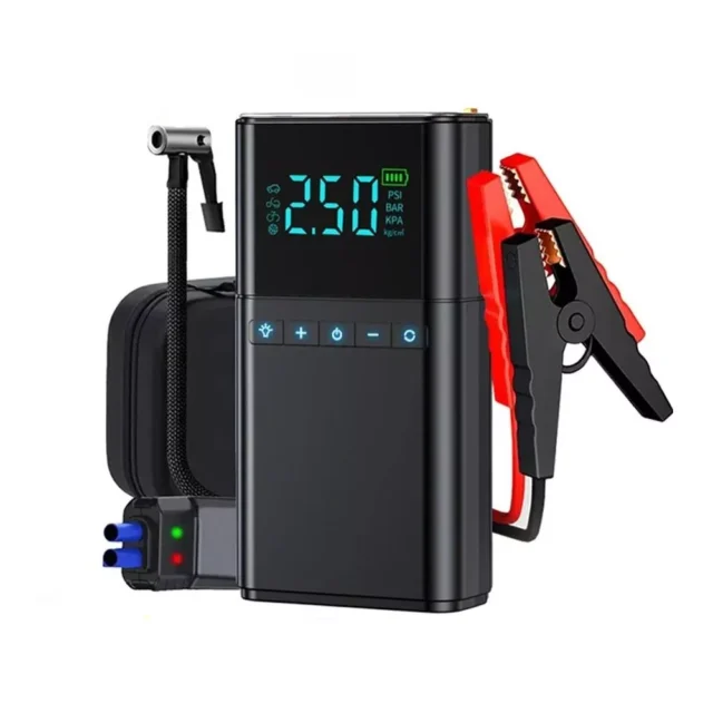 Whether it’s a dead battery, a low tire, or the need for extra lighting during an emergency, this all-in-one portable Car Jump Starter and Air Pump has you covered. Compact and easy to use, this multifunctional device combines a powerful jump starter, efficient air compressor, power bank, and LED emergency light—all in one compact design. Perfect for 12V cars, motorcycles, and bikes, this reliable tool is an essential travel companion for any driver, ensuring you’re ready for anything on the road.