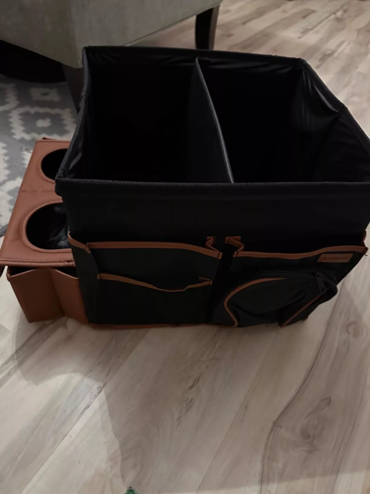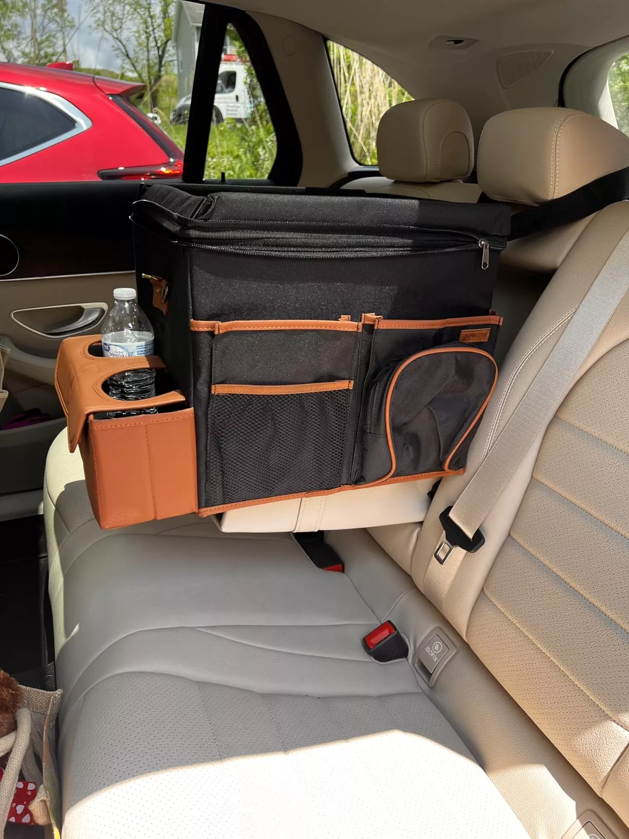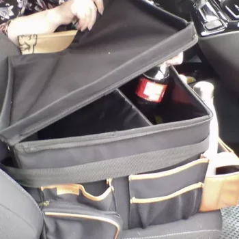 Large compartment with a removable divider, eight side pockets and two front pockets can hold everything you need on the road – from drinks to gadgets. It is suitable for all car models, and you can use it in your front seat, back seat, or even in the trunk. Plus, the lid works as a backseat table!