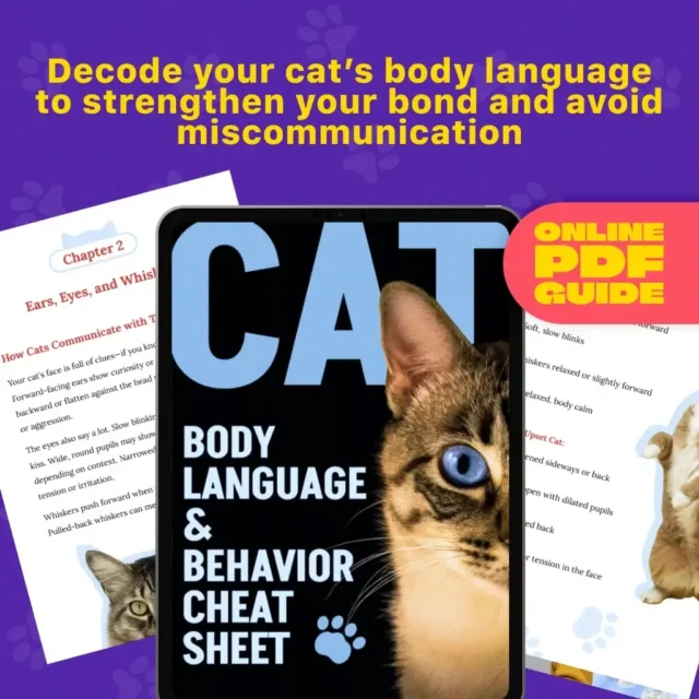 The Cat Body Language & Behavior Cheat Sheet is ideal for new cat owners, pet parents looking to improve communication, and anyone curious about feline behavior.