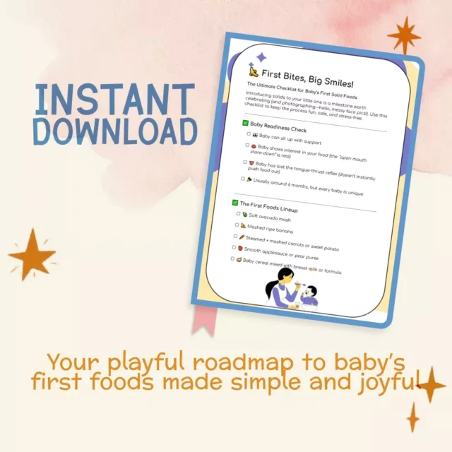 Ready to begin the exciting journey of introducing solids? First Bites, Big Smiles is your go-to printable digital checklist designed to help parents feel confident, calm, and prepared as baby takes those adorable first bites. Created with love and backed by practical know-how, this easy-to-follow guide simplifies the process of starting solids with clear, baby-friendly steps and expert-approved recommendations. Perfect for new parents wondering when and how to start, this checklist combines tips for first solid foods for baby with joyful encouragement to make mealtime memorable (and way less messy!).