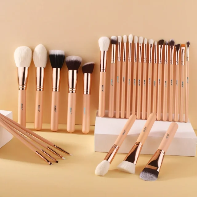 Our brush set boasts an exceptional blend of natural and synthetic bristles, including luxurious goat hair, pony hair, and nano fiber. This combination ensures smooth, even, and comfortable application. The brushes come in a variety of sizes and types, ranging from big powder brushes to detailed liners, meeting all your makeup needs. Encased in a chic pink and rose gold finish, each brush is a work of art in itself.