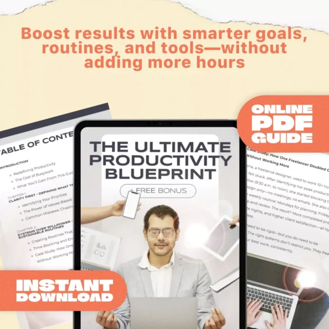 Ready to break free from endless busywork and start making real progress toward your goals? The Ultimate Productivity Blueprint is your all-in-one digital guide designed to transform your daily routines, supercharge your time management, and help you finally achieve the work-life balance you crave. Whether you’re a freelancer, entrepreneur, or simply someone striving to do more in less time, this productivity guide download gives you actionable strategies and clarity to turn your ambitions into reality—without the burnout.