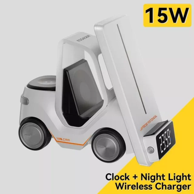 Whether you’re at home, in the office, or traveling, this Universal Wireless Charger is designed to adapt to your lifestyle. Its unique forklift-inspired design isn’t just eye-catching; it’s incredibly practical. The holder and clamp provide a secure base for your devices, allowing you to use it in your car or on your desk. And with a built-in night light, it creates a perfect bedside ambiance that makes nighttime charging simple and visually appealing. Its 15W power output ensures a fast charge every time, so you’re always ready to go. With this versatile device, charging your essentials has never been easier or more stylish.